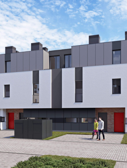 Budowa 28 domów w zabudowie szeregowej w których znajdują się 4 mieszkania usytuowane na 3kondygnacjach o powierzchni od 88m2 do 100 m2. Do każdego mieszkania przynależy ogródek i zewnętrzne stanowisko postojowe.